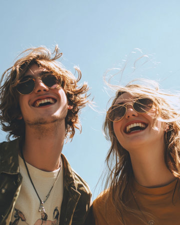 Two young adults embrace a sunny day, sharing laughter as their hair dances in the wind. They radiate joy and a sense of freedom amidst the beautiful outdoor setting.