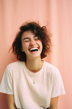 Portrait of a beautiful young woman with curly hair laughing on a pink background.