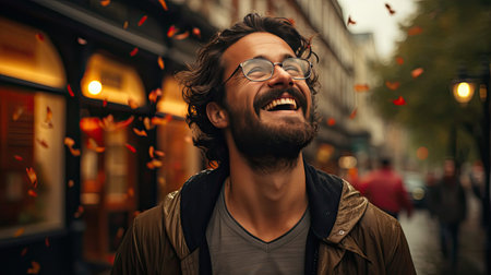 Smiling bearded young male model rejoices coming weekends, dressed casually, over background. Positive pleased student being in good mood after successfully passed exams at college. Generative AI art