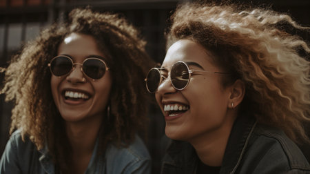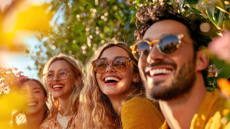 Happy diverse friends laughing together in autumn sunlight. A.I.