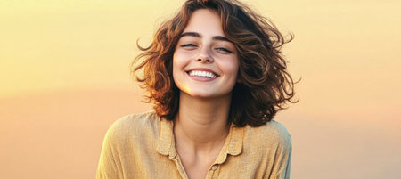 A woman is smiling broadly, illuminated by sunlight. Her dark hair contrasts with a yellow wall. The image features natural light and shadows, suggesting an interior setting. This photograph could be suitable for various commercial and editorial applications to convey happiness or positivity.