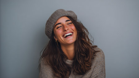 Portrait of a beautiful young woman laughing and looking at camera against grey background