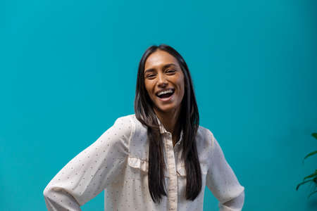 Portrait of happy biracial businesswoman with long black hair against blue wall at workplace. unaltered, emotion, occupation, business, and modern office concept.