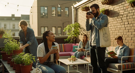 A group of friends socializing on a rooftop patio with plants and furniture