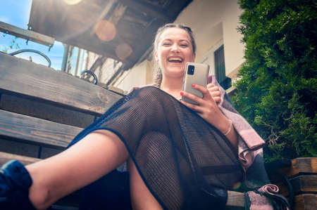 Beautiful Asian lady holding smartphone and taking picture while sitting on waterfront