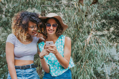 A girl with afro hair and a caucasian girl make a video call smiling while standing on the street