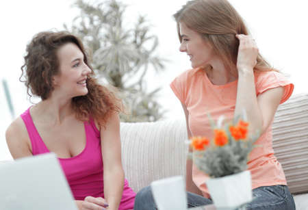 Young women sitting on sofa and watching photos on mobile phone with couple talking in the background, they visiting home party