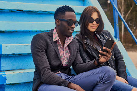 Caucasian female in sunglasses and stylish Black male sits on a step and using smart phones.