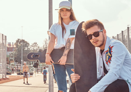 Close-up portrait of young trendy dressed hipster couple with skateboards posing at city sports complex on sunny day