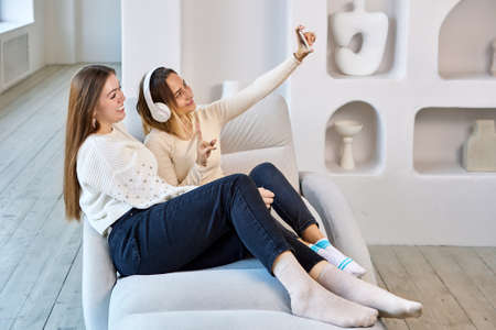 Woman in cordless headphones makes selfie with sister by phone indoors.
