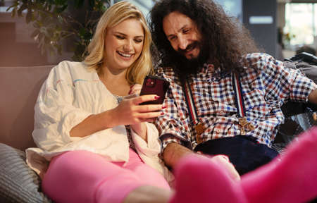 Casual man and woman talking happily while drink coffee and looking mobile phone - happy time lifestyle in coffee shop