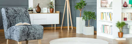 Open book placed on grey chair with floral pattern standing in stylish room interior with fresh plants and books