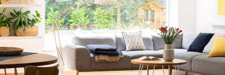 Panorama of flowers on table next to grey corner sofa in apartment interior with window. Real photo