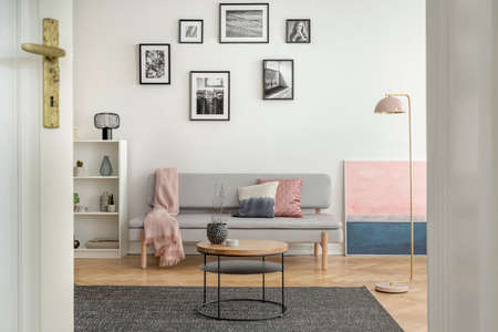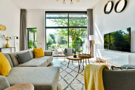 Stylish interior design of living room with elegant furniture and soft comfy couch