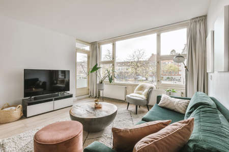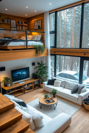 Modern living space with large windows and stylish furniture in a cozy urban loft setting
