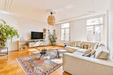 Interior of living room with comfortable sofa and TV against windows in contemporary apartment