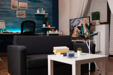 Empty living room decorated with couch and modern TV in apartment. Nobody in interior space at home with crutches and walk frame for disabled people. Cozy furniture and television