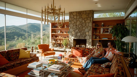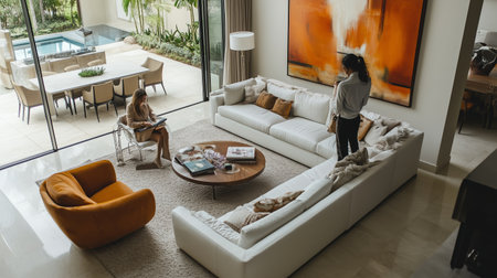 Bright and modern living room with a large white sofa and a vibrant painting, featuring two women enjoying their time together