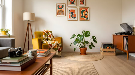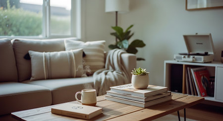 A warm and inviting living room with a beige sofa, coffee table, and vinyl record player, featuring a mug, books, and plants, bathed in natural light.