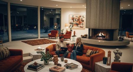 Young couple sitting in a lobby of a hotel with a fireplace.