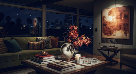A cozy living room at night featuring a green sofa, decorative pillows, a coffee table with books, a vase with autumn leaves, and a record player, with city lights visible through large windows