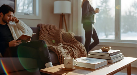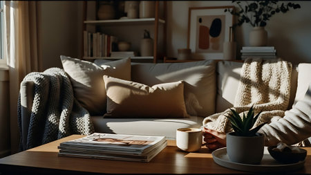 A serene living room setting with a wooden table featuring a cup of coffee, a stack of books, and a potted plant, surrounded by comfortable furniture and soft lighting.