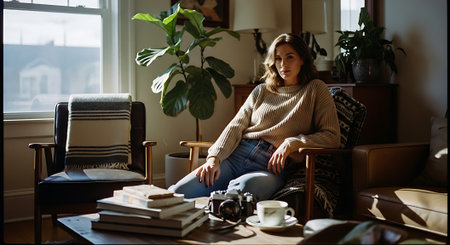 Bright and cozy living room with natural light, featuring modern decor and a woman enjoying a winter day indoors