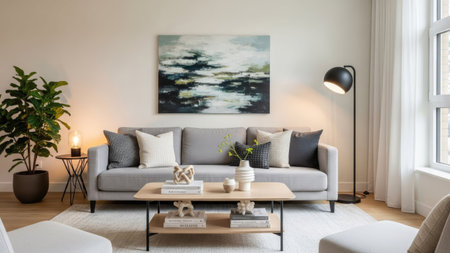 A serene living room scene featuring a comfortable sofa with pillows, a wooden coffee table with a book, mug, and plant, and a warm lamp casting a cozy glow.