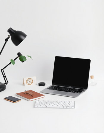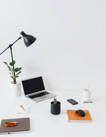 Minimalistic workspace with computer, books, stationery and lamp on white wall background