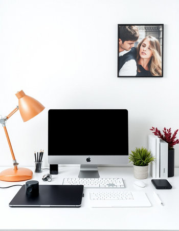 Modern workspace with computer, supplies and decorations. Mock up, 3D Rendering