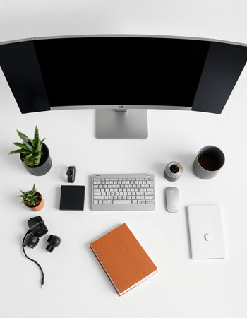 Modern workspace with computer, keyboard, coffee cup, stationery and plant on white background.