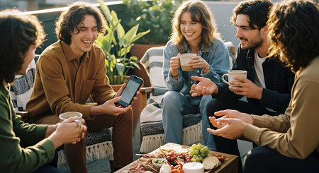 A group of five friends enjoying a sunny day outdoors, laughing and sharing moments, one person taking a photo, others holding cups and a book