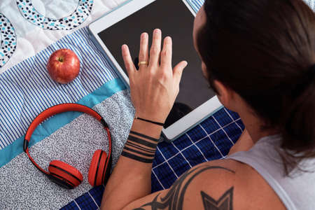 Young man with tattoos lying on bed and pressing on screen digital tablet with headphones and apple near by him
