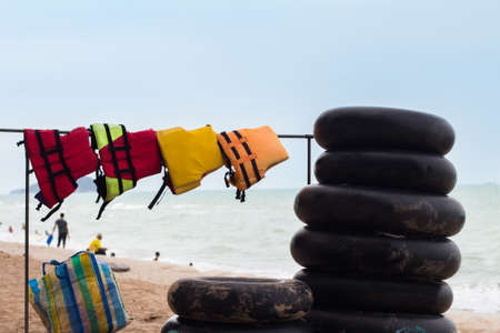 Close-up group of Life jacket or life vest hanging under the shelter at Pangkor Island, Malaysia