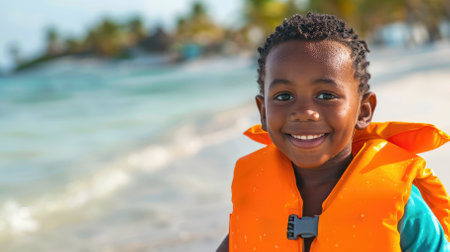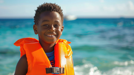 A dark-skinned boy in an orange life jacket against the background of the sea with copyspace. High quality photo