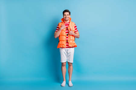 Full length body photo man wearing life vest on the beach smiling isolated on vibrant blue color background