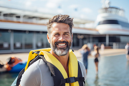 Portrait of smiling man in life jacket standing on pier and looking at camera
