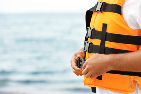 Male lifeguard putting on life vest near sea, closeup