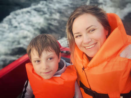close up portrait young beautiful caucasian woman and little son having a ride on speed boat. Mother and child dressed in orange protective vessel
