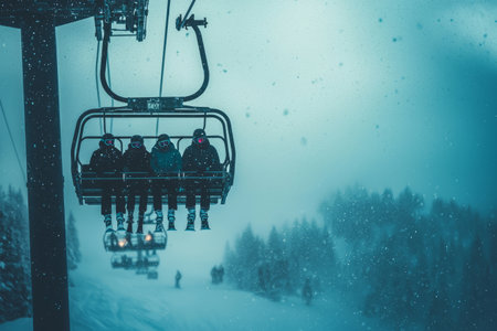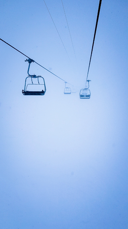 A ski lift climbs into the clouds on a cloudy day, transporting skiers to higher altitudes for their descent down the slopes, A ski lift ascending into the clouds