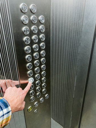 Man hand pointing number 3 button in elevator. Steel interior panel. Change year concept. Waiting new step. Up action. Start claustrophobia moment. Moving click