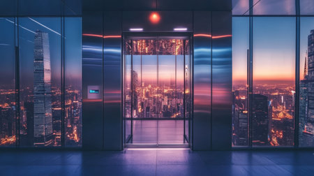 This captivating image showcases a sleek modern elevator with glass walls, offering a breathtaking view of a vibrant city skyline at sunset.