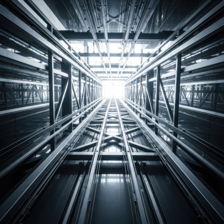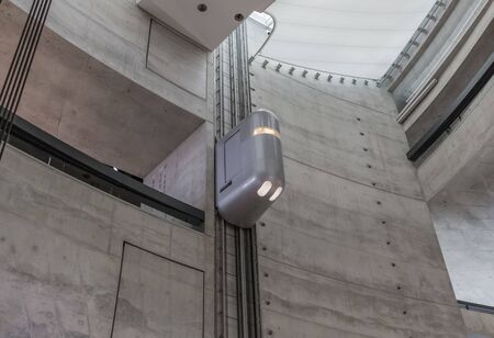 Open elevator lift shaft. Modern architecture with transparent ceiling. Shopping mall or business center. Maintenance repair and service