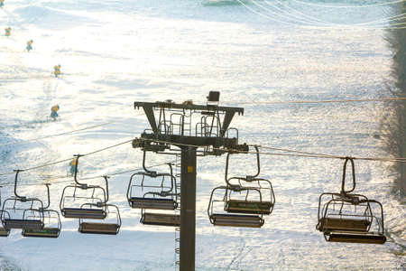Ski lift on the slop in mountain ski resort with skiers on the lift. Cableway for tourists, skiers and snowboarders. active rest in the mountains in winter. Special light green filter. High quality photo