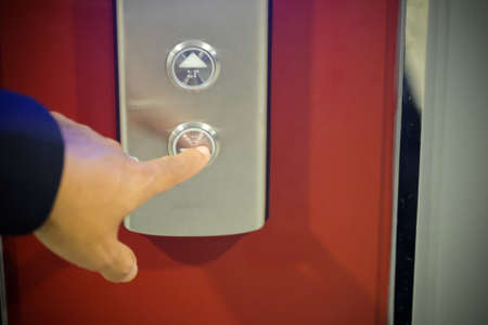 Male forefinger pressing on emergency stop and alarm button in elevator (lift). Mechanical engineering concept