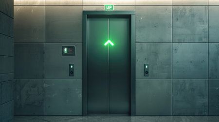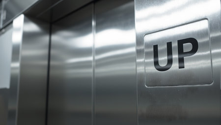 Modern Up sign next to elevator door in sleek stainless steel exuding professionalism