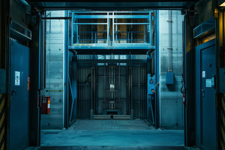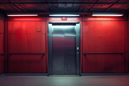 Modern elevator interior with metal doors and glowing lights. 3d rendering