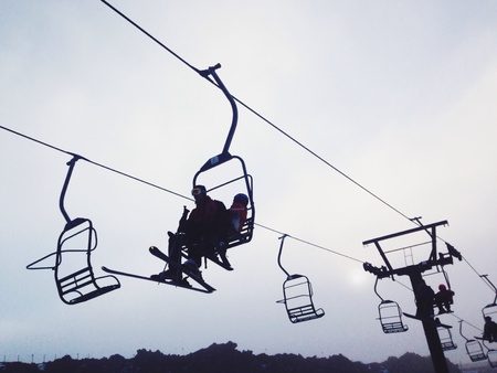 Bottom view of skiers have a fun on chair lift in the sky and steel cable