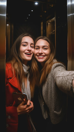 Three girlfriends sitting in a ski lift elevator. Feet Selfie. Mountains travel concept.