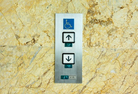 Background of buttons on an elevator panel with button for visually impaired in skyscraper. Inside modern metal elevator houses floor selection buttons with sunlight. Copy space for site